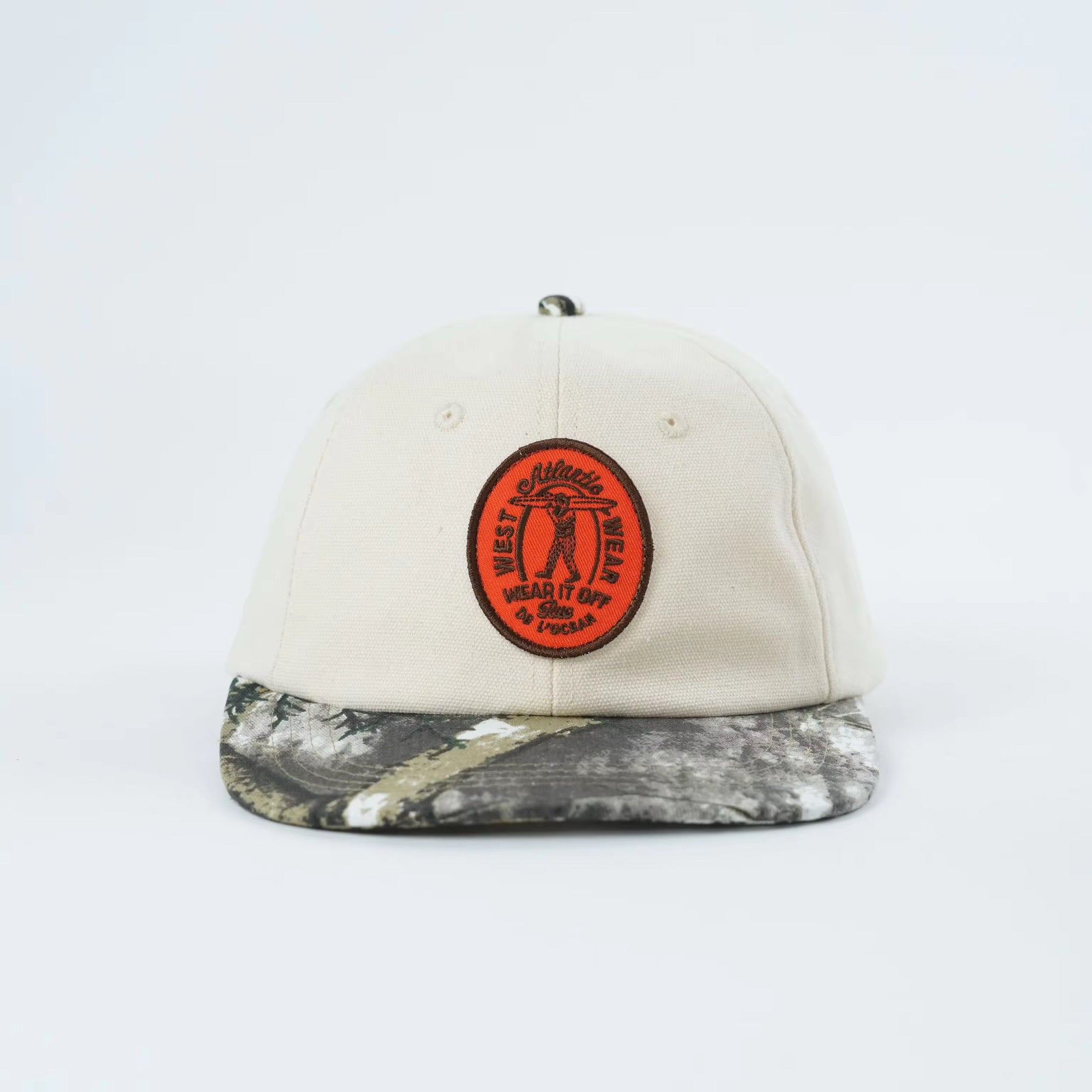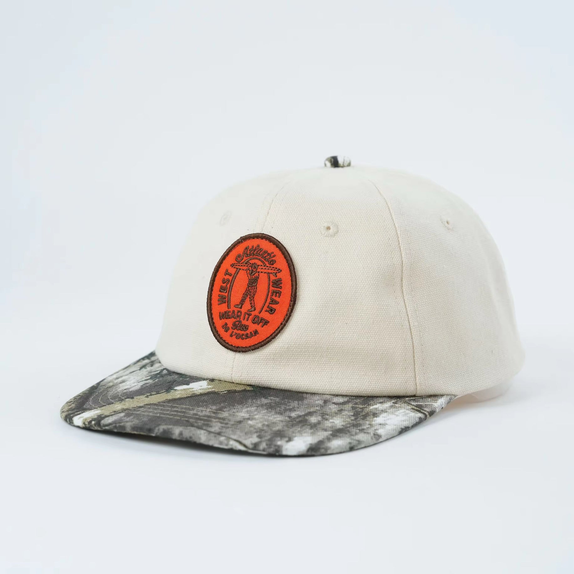 The camouflage brim is cut from unique fabric panels — no two pieces are the same, making each cap truly one of a kind.